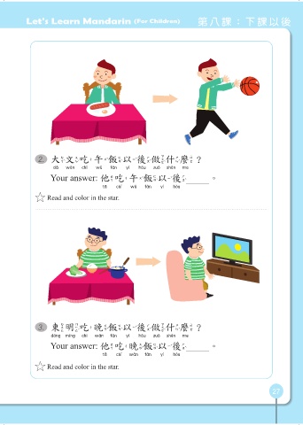 Let's Learn Mandarin (For Children) 第八課:下課以後 2. 大文吃午飯以後做什麼? 大文吃午飯以後做什麼 Your answer: 他吃午飯以後 。 他吃午飯以後 Read and color in the star. 3. 東明吃晚飯以後做什麼? 東明吃晚飯以後做什麼 Your answer: 他吃晚飯以後 。 他吃晚飯以後 Read and color in the star. 27