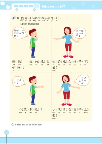 Where Is It? B. 重複音檔所說的句子。 重複音檔所說的句子 Listen and repeat. 媽媽,我 你的球 的球在哪 在椅子 裡? 下面。 媽 媽 ,我的球在 你的球在椅子下 媽 媽 我 的球在 你的球在椅 子下 哪裡? 面。 哪裡 面 小汽車 小汽車 在桌子 呢? 上面。 小汽車呢? 小汽車在桌子上 小汽車呢 小汽車在桌子 上 面。 面 Listen and color in the star. 34