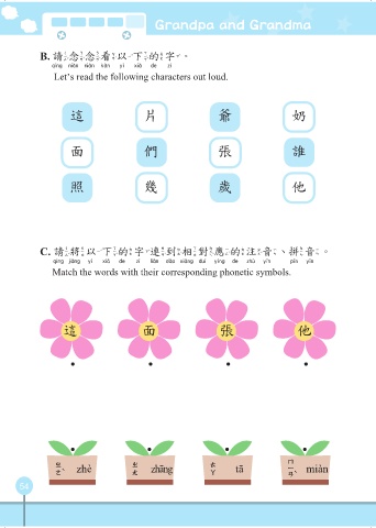 Grandpa and Grandma B. 請念念看以下的字。 請念念看以下的字 Let’s read the following characters out loud. 這 片 爺 奶 面 們 張 誰 照 幾 歲 他 C. 請將以下的字連到相對應的注音、拼音。 請將以下的字連到相對應的注音 拼音 Match the words with their corresponding phonetic symbols. 這 面 張 他 這 zhè 張 zhāng 他 tā 面 miàn 54