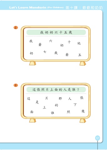 Let's Learn Mandarin (For Children) 第十課:爺爺和奶奶 2. 我奶奶六十五歲 我 六 十 爺 奶 他 奶 七 歲 爺 五 3. 這張照片上面的人是誰? 這 片 那 人 張 是 的 下 上 面 誰 照 幾 57