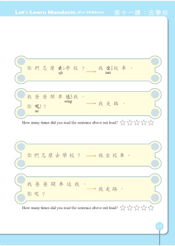 Let's Learn Mandarin (For Children) 第十一課:去學校 你們怎麼 去學校? 我 坐校車。 qù zuò 我爸爸開車 送我。 sòng 我走路。 你 呢? ne How many times did you read the sentence above out loud? 你們怎麼去學校? 我坐校車。 我爸爸開車送我。 我走路。 你呢? How many times did you read the sentence above out loud? 67