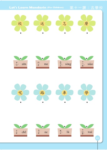 Let's Learn Mandarin (For Children) 第十一課:去學校 校 送 怎 麼 怎 zěn 麼 me 送 sòng 校 xiào 呢 路 車 學 車 chē 呢 ne 路 lù 學 xué 69