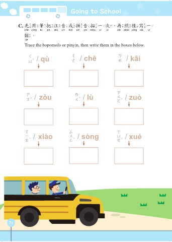 Going to School C. 先用筆把注音或拼音描一次,再照樣寫一 先用筆把注音或拼音描一次 再照樣寫一 個。 個 Trace the bopomofo or pinyin, then write them in the boxes below. 去 / qù 車 / chē 開 / kāi 走 / zǒu 路 / lù 坐 / zuò 校 / xiào 送 / sòng 學 / xué 74