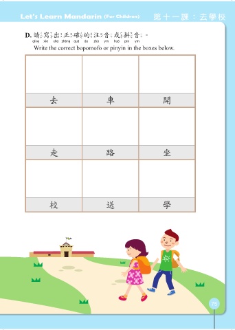 Let's Learn Mandarin (For Children) 第十一課:去學校 D. 請寫出正確的注音或拼音。 請寫出正確的注音或拼音 Write the correct bopomofo or pinyin in the boxes below. 去 車 開 走 路 坐 校 送 學 75