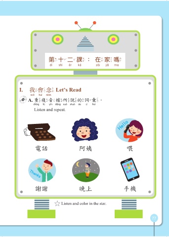 Let's Learn Mandarin (For Children) 第十二課:在家嗎在家嗎 第十二課: 第十二課 再家嗎 I. 我會念 Let’s Read 我會念 A. 重複音檔所說的詞彙。 重複音檔所說的詞彙 Listen and repeat. Hello 電話 阿姨 喂 Thanks 謝謝 晚上 手機 Listen and color in the star. 77