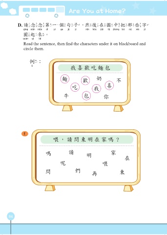Are You at Home? D. 請念念第一個句子,然後在圖中把那些字 請念念第一個句子 然後在圖中把那些字 圈起來。 圈起來 Read the sentence, then find the characters under it on blackboard and circle them. 例: 例 我喜歡吃麵包 麵 歡 奶 不 吃 我 喜 牛 包 你 1. 喂,請問東明在家嗎? 嗎 請 明 家 在 呢 喂 問 們 再 東 84