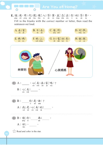 E. 媽媽 F. 晚上 G. 打電話來 H. 謝謝