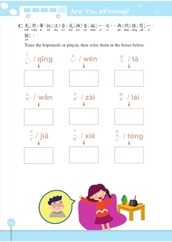 Are You at Home? C. 先用筆把注音或拼音描一次,再照樣寫一 先用筆把注音或拼音描一次 再照樣寫一 個。 個 Trace the bopomofo or pinyin, then write them in the boxes below. 請 / qǐng 問 / wèn 他 / tā 晚 / wǎn 再 / zài 來 / lái 家 / jiā 謝 / xiè 同 / tóng 88