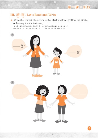 第一課:你好 第一課:你好 III. 讀寫 Let’s Read and Write 讀寫 A. Write the correct characters in the blanks below. (Follow the stroke order taught in the textbook.) 請看圖填入適當的字。( 請參照課文筆順 ) 請看圖填入適當的字 請參照課文筆順 1. 好 好 好 好 2. 9