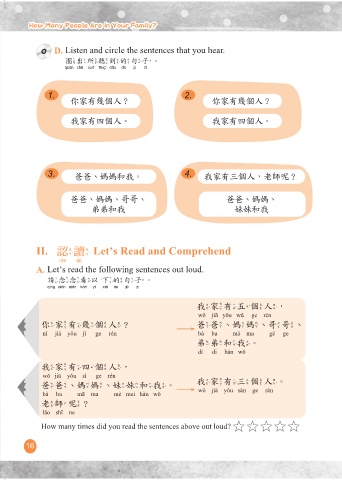 3. 爸爸、媽媽和我。 4. 我家有三個人,老師呢?