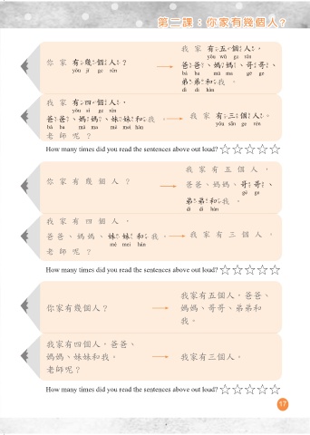 爸爸、媽媽 、 妹 妹 和 我。 我家有三個人。