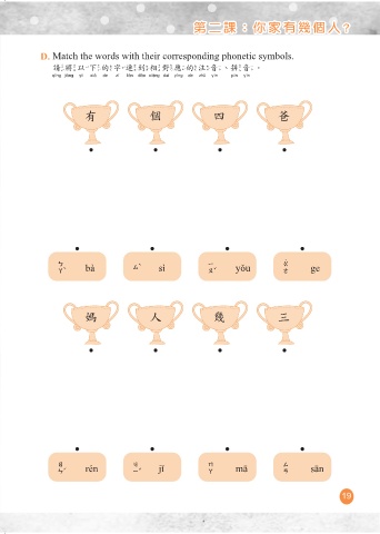 第二課:你家有幾個人? 第二課:你家有幾個人? D. Match the words with their corresponding phonetic symbols. 請將以下的字連到相對應的注音、拼音。 請將以下的字連到相對應的注音 拼音 有 個 四 爸 爸 bà 四 sì 有 yǒu 個 ge 媽 人 幾 三 人 rén 擠 jǐ 媽 mā 三 sān 19
