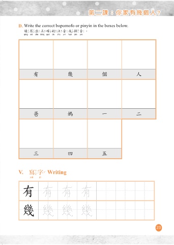 第二課:你家有幾個人? 第二課:你家有幾個人? D. Write the correct bopomofo or pinyin in the boxes below. 請寫出正確的注音或拼音。 請寫出正確的注音或拼音 有 幾 個 人 爸 媽 一 二 三 四 五 V. 寫字 Writing 寫字 有 有 有 有 幾 幾 幾 幾 23
