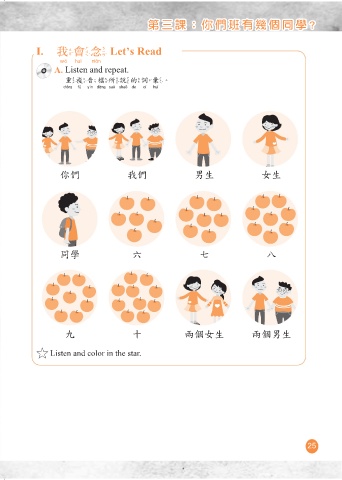 第三課:你們班有幾個同學? 第三課:你們班有幾個同學? I. 我會念 Let’s Read 我會 念 A. Listen and repeat. 重複音檔所說的詞彙。 重複音檔所說的詞彙 你們 我們 男生 女生 同學 六 七 八 九 十 兩個女生 兩個男生 Listen and color in the star. 25