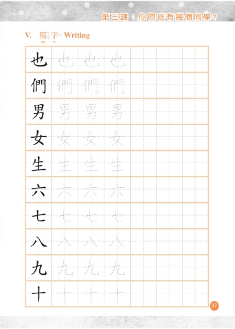 第三課:你們班有幾個同學? 第三課:你們班有幾個同學? V. 寫字 Writing 寫字 也 也 也 也 們 們 們 們 男 男 男 男 女 女 女 女 生 生 生 生 六 六 六 六 七 七 七 七 八 八 八 八 九 九 九 九 十 十 十 十 37