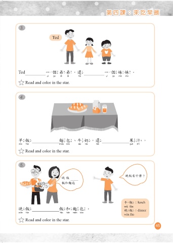 第四課:來吃早飯 第四課:來吃早飯 3. Ted Ted 一個弟弟,還 一個妹妹。 一個弟弟 還 一個妹妹 Read and color in the star. 4. 早飯 麵包、牛奶,還 果汁。 早飯 麵包 牛奶 還 果汁 Read and color in the star. 5. 晚飯有什麼? 晚飯 飯和麵包 午飯:lunch wǔ fàn 晚飯 飯和麵包。 晚飯:dinner 晚飯 飯漢麵包 wǎn fàn Read and color in the star. 45