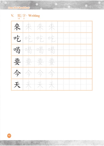 Come Eat Breakfast Come Eat Breakfast V. 寫字 Writing 寫字 來 來 來 來 吃 吃 吃 吃 喝 喝 喝 喝 要 要 要 要 今 今 今 今 天 天 天 天 48