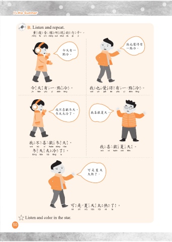 I Like Summer I Like Summer B. Listen and repeat. 重複音檔所說的句子。 重複音檔所說的句子 我也覺得有 一點冷。 今天有一 點冷。 今天有一點冷。 我也覺得有一點冷。 今天有一點冷 我也覺得有一點冷 我不喜歡冬天, 冬天太冷了。 我喜歡夏天。 我不喜歡冬天, 我不喜歡冬天 我喜歡夏天。 冬天太冷了。 我喜歡夏天 冬天太冷了 可是夏天 太熱了。 可是夏天太熱了。 可是夏天太熱了 Listen and color in the star. 50