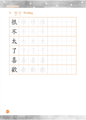 I Like Summer I Like Summer V. 寫字 Writing 寫字 很 很 很 很 不 不 不 不 太 太 太 太 了 了 了 了 喜 喜 喜 喜 歡 歡 歡 歡 62