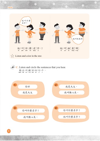 Hello Hello 他叫什麼 名字? 他叫林東明 他叫什麼名字? 他叫林東明 他叫什麼名字 他叫林東明 Listen and color in the star. C. Listen and circle the sentences that you hear. 圈出所聽到的句子。 圈出所聽到的句子 1. 2. 你好 我是大文。 我是大文 我叫陳心美。 3. 4. 你叫什麼名字? 你叫什麼名字? 我叫陳心美。 他叫什麼名字? 6