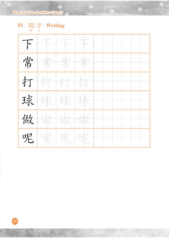 What Do You Do After Class? What Do You Do After Class? IV. 寫字 Writing 寫字 下 下 下 下 常 常 常 常 打 打 打 打 球 球 球 球 做 做 做 做 呢 呢 呢 呢 30