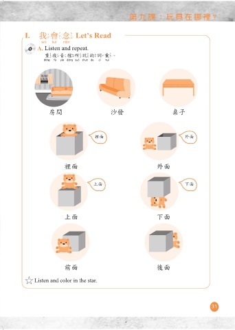 第九課:玩具在哪裡? 第九課:玩具在哪裡? I. 我會念 Let’s Read 我會 念 A. Listen and repeat. 重複音檔所說的詞彙。 重複音檔所說的詞彙 房間 沙發 桌子 裡面 外面 裡面 外面 上面 下面 上面 下面 前面 後面 Listen and color in the star. 31