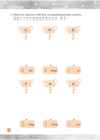 Who Are They? Who Are They? D. Match the characters with their corresponding phonetic symbols. 請將以下的字連到相對應的注音、拼音。 請將以下的字連到相對應的注音 拼音 這 那 張 這 zhè 張 zhāng 那 nà 中 兩 右 兩 liǎng 中 zhōng 右 yòu 50