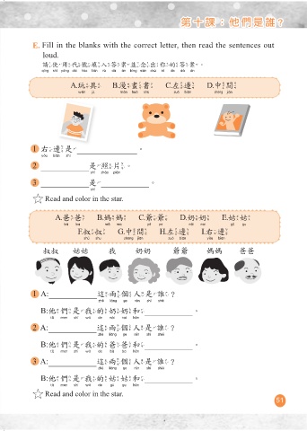 E. Fill in the blanks with the correct letter, then read the sentences out