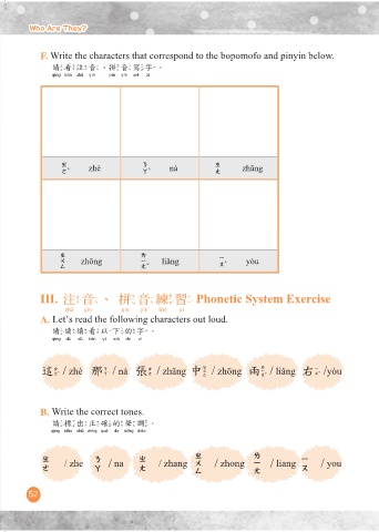F. Write the characters that correspond to the bopomofo and pinyin below.