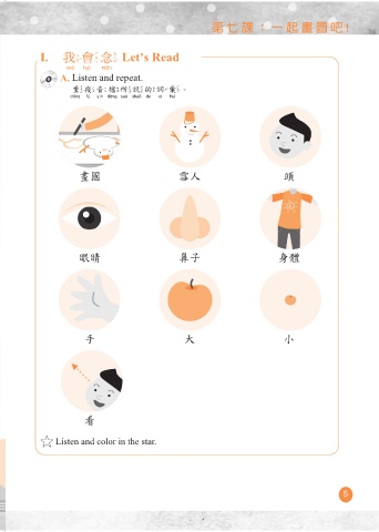 第七課:一起畫圖吧! 第七課:一起畫圖吧! I. 我會念 Let’s Read 我會 念 A. Listen and repeat. 重複音檔所說的詞彙。 重複音檔所說的詞彙 畫圖 雪人 頭 眼睛 鼻子 身體 手 大 小 看 Listen and color in the star. 5