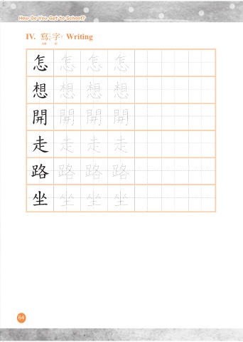 How Do You Get to School? How Do You Get to School? IV. 寫字 Writing 寫字 怎 怎 怎 怎 想 想 想 想 開 開 開 開 走 走 走 走 路 路 路 路 坐 坐 坐 坐 64