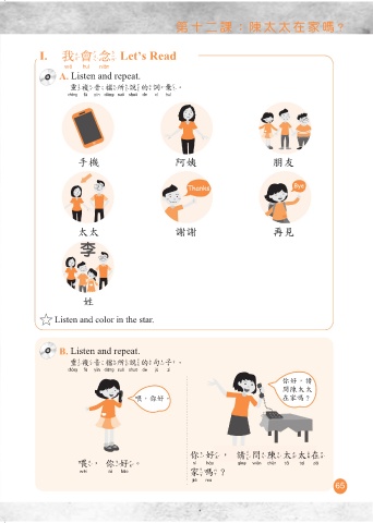 第十二課:陳太太在家嗎? 第十二課:陳太太在家嗎? I. 我會念 Let’s Read 我會念 A. Listen and repeat. 重複音檔所說的詞彙。 重複音檔所說的詞彙 手機 阿姨 朋友 太太 謝謝 再見 姓 Listen and color in the star. B. Listen and repeat. 重複音檔所說的句子。 重複音檔所說的句子 你好,請 問陳太太 喂,你好。 在家嗎? 你好,請問陳太 在 ,你好。 你 好 請問陳太太再 為 你好 家嗎? 家嗎 65