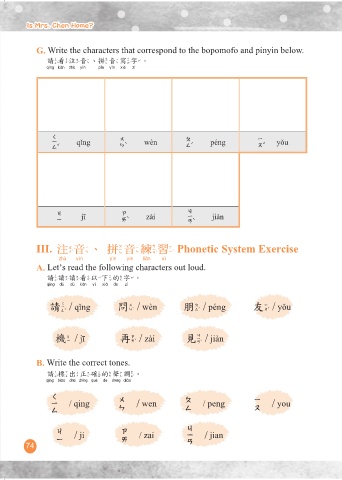 G. Write the characters that correspond to the bopomofo and pinyin below.