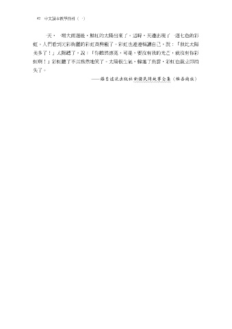 42 中文讀本教學指引(一) 一天,一場大雨過後,鮮紅的太陽出來了。這時,天邊出現了一道七色的彩 虹。人們看到光彩絢麗的彩虹高興極了。彩虹也連連稱讚自己,說:「我比太陽 美多了!」太陽聽了,說:「你雖然漂亮,可是,要沒有我的光芒,就沒有你彩 虹啊!」彩虹聽了不以為然地笑了。太陽很生氣,躲進了烏雲,彩虹也就立即消 失了。 錄自遠流出版社新疆民間故事全集(維吾爾族)