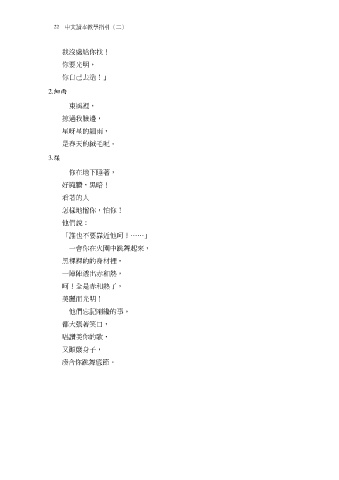 22 中文讀本教學指引(二) 我沒處給你找! 你要光明, 你自己去造!」 2.細雨 東風裡, 掠過我臉邊, 星呀星的細雨, 是春天的絨毛呢。 3.煤 你在地下睡著, 好腌臢,黑暗! 看著的人 怎樣地憎你,怕你! 他們說: 「誰也不要靠近他呵!……」 一會你在火園中跳舞起來, 黑裸裸的的身材裡, 一陣陣透出赤和熱, 呵!全是赤和熱了, 美麗而光明! 他們忘記剛纔的事, 都大張著笑口, 唱讚美你的歌, 又顛簸身子, 合你跳舞底節。