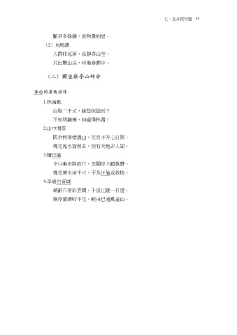 七、五言絕句選 55 願君多採擷,此物最相思。 (2)鳥鳴澗 人閑桂花落,夜靜春山空。 月出驚山鳥,時鳴春澗中。 (二)獨坐敬亭山部分 李白的其他詩作 1.秋浦歌 白髮三千丈,緣愁似箇長? 不知明鏡裡,何處得秋霜! 2.山中問答 問余何事棲碧山,笑而不答心自閑。 桃花流水窅然去,別有天地非人間。 3.贈汪倫 李白乘舟將欲行,忽聞岸上踏歌聲。 桃花潭水深千尺,不及汪倫送我情。 4.早發白帝城 朝辭白帝彩雲間,千里江陵一日還。 兩岸猿聲啼不住,輕舟已過萬重山。