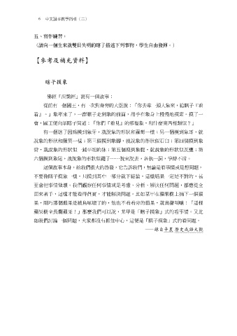 看』。」象牽來了,一群瞎子走到象的前面,用手在象身上慢慢地摸索。摸了一