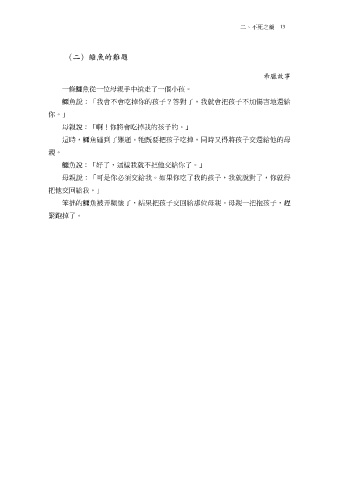 二、不死之藥 13 (二)鱷魚的難題 希臘故事 一條鱷魚從一位母親手中搶走了一個小孩。 鱷魚說:「我會不會吃掉你的孩子?答對了,我就會把孩子不加傷害地還給 你。」 母親說:「啊!你將會吃掉我的孩子的。」 這時,鱷魚碰到了難題。牠既要把孩子吃掉,同時又得將孩子交還給他的母 親。 鱷魚說:「好了,這樣我就不把他交給你了。」 母親說:「可是你必須交給我。如果你吃了我的孩子,我就說對了,你就得 把他交回給我。」 笨拙的鱷魚被弄糊塗了,結果把孩子交回給那位母親。母親一把抱孩子,趕 緊跑掉了。