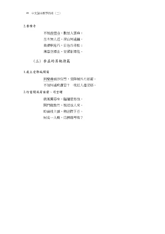48 中文讀本教學指引(三) 2.香積寺 不知香積寺,數里入雲峰; 古木無人逕,深山何處鐘。 泉聲咽危石,日色冷青松; 薄暮空潭曲,安禪制毒龍。 (三)李益的其他詩篇 1.夜上受降城聞笛 回樂峰前沙似雪,受降城外月如霜。 不知何處吹蘆管?一夜征人盡望鄉。 2.竹窗聞風寄苗發、司空曙 微風驚暮坐,臨牖思悠哉。 開門復動竹,疑是故人來。 時滴枝上露,稍沾階下苔。 何當一入幌,為拂綠琴埃?