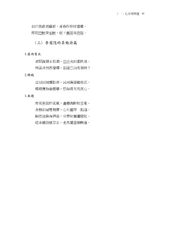 十一、七言律詩選 81 白日放歌須縱酒,青春作伴好還鄉。 即從巴峽穿巫峽,便下襄陽向洛陽。 (三)李商隱的其他詩篇 1.夜雨寄北 君問歸期未有期,巴山夜雨漲秋池。 何當共剪西窗燭,卻話巴山夜雨時? 2.嫦娥 雲母屏風燭影深,長河漸落曉星沉。 嫦娥應悔偷靈藥,碧海青天夜夜心。 3.無題 昨夜星辰昨夜風,畫樓西畔桂堂東。 身無彩鳳雙飛翼,心有靈犀一點通。 隔座送鉤春酒暖,分曹射覆蠟燈紅。 嗟余聽鼓應官去,走馬蘭臺類轉蓬。