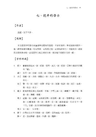 本文藉挖井的啟示來論述學習應有的態度。主旨在說明:學習就如同挖井一