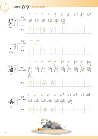 09 Lesson 臺灣的原住民族 അන ኤ 墾 stroke order kěn ᄳο ኤ ኤ 墾 墾 അන stroke order ɕ 丁 dīng ᄳο ɕ ɕ 丁 丁 ᚆ 蘭 stroke order അන lán ᚆ ᚆ 蘭 蘭 ᄳο അන Ꮙ 嶼 stroke order yǔ ᄳο Ꮙ Ꮙ 嶼 嶼 96