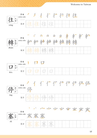 Welcome to Taiwan അන stroke order ֻ 往 wǎng ᄳο ֻ ֻ 往 往 അන ᔷ 轉 stroke order zhuǎn ᄳο ᔷ ᔷ 轉 轉 അන stroke order ɹ 口 kǒu ᄳο ɹ ɹ 口 口 അන ৾ 停 stroke order tíng ᄳο ৾ ৾ 停 停 അන ෦ 塞 stroke order sāi ᄳο ෦ ෦ 塞 塞 17
