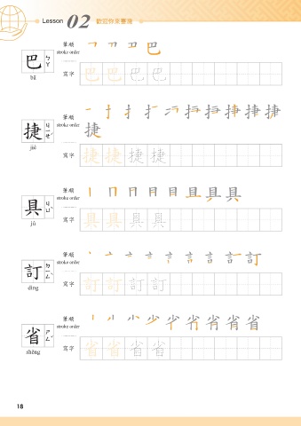 02 Lesson 歡迎你來臺灣 അන stroke order ˋ 巴 bā ᄳο ˋ ˋ 巴 巴 അන ઠ 捷 stroke order jié ᄳο ઠ ઠ 捷 捷 അන stroke order Ո 具 jù ᄳο Ո Ո 具 具 അන stroke order ࠈ 訂 dìng ᄳο ࠈ ࠈ 訂 訂 അන stroke order 省 shěng ᄳο 省 省 18