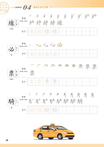 04 Lesson 捷運又快又方便 അන ᇞ 線 stroke order xiàn ᄳο ᇞ ᇞ 線 線 അන stroke order ̀ 必 bì ᄳο ̀ ̀ 必 必 അන ୃ 票 stroke order piào ᄳο ୃ ୃ 票 票 അන ᕣ 騎 stroke order qí ᄳο ᕣ ᕣ 騎 騎 38