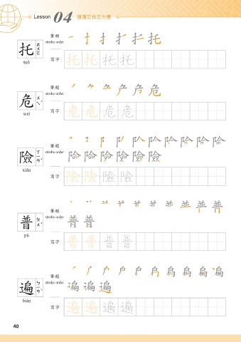 04 Lesson 捷運又快又方便 അන stroke order ϖ 托 tuō ᄳο ϖ ϖ 托 托 അන stroke order Κ 危 wéi ᄳο Κ Κ 危 危 അන ᎈ 險 stroke order xiǎn ᄳο ᎈ ᎈ 險 險 അන ౷ 普 stroke order pǔ ᄳο ౷ ౷ 普 普 അන ཁ 遍 stroke order biàn ᄳο ཁ ཁ 遍 遍 40