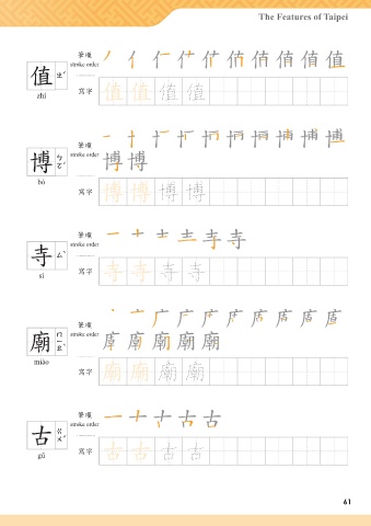 The Features of Taipei അන stroke order ࠽ 值 zhí ᄳο ࠽ ࠽ 值 值 അන ௹ 博 stroke order bó ᄳο ௹ ௹ 博 博 അන stroke order υ 寺 sì ᄳο υ υ 寺 寺 അන ᄽ 廟 stroke order miào ᄳο ᄽ ᄽ 廟 廟 അන stroke order ̚ 古 gǔ ᄳο ̚ ̚ 古 古 61