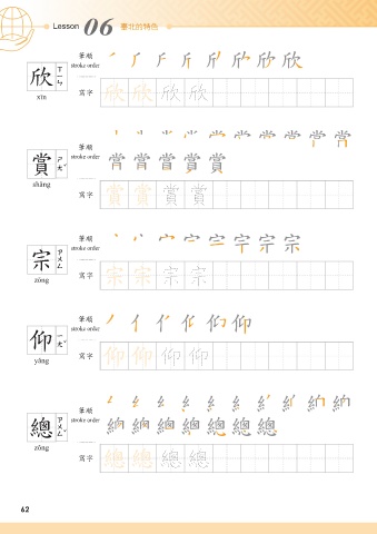 06 Lesson 臺北的特色 അන stroke order ؚ 欣 xīn ᄳο ؚ ؚ 欣 欣 അන ሧ 賞 stroke order shǎng ᄳο ሧ ሧ 賞 賞 അන stroke order ֚ 宗 zōng ᄳο ֚ ֚ 宗 宗 അන stroke order 仰 yǎng ᄳο 仰 仰 അන ᐼ 總 stroke order zǒng ᄳο ᐼ ᐼ 總 總 62
