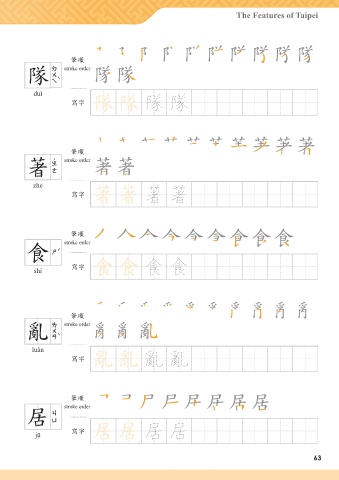 The Features of Taipei അන ඟ 隊 stroke order duì ᄳο ඟ ඟ 隊 隊 അන ഹ 著 stroke order zhe ᄳο ഹ ഹ 著 著 അන stroke order 食 shí ᄳο 食 食 അන 亂 stroke order luàn ᄳο 亂 亂 അන stroke order ֢ 居 jū ᄳο ֢ ֢ 居 居 63