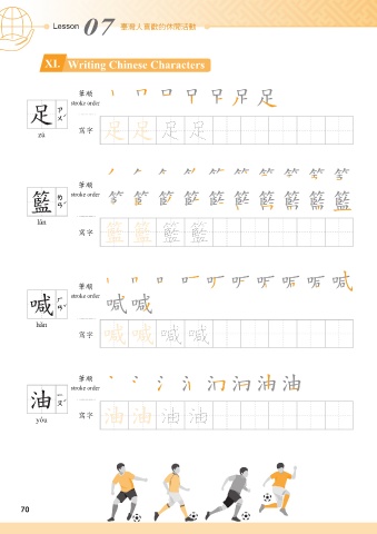 07 Lesson 臺灣人喜歡的休閒活動 XI. Writing Chinese Characters അන stroke order ԑ 足 zú ᄳο ԑ ԑ 足 足 അන ᘫ 籃 stroke order lán ᄳο ᘫ ᘫ 籃 籃 അන 喊 stroke order hǎn ᄳο 喊 喊 അන stroke order ذ 油 yóu ᄳο ذ ذ 油 油 70